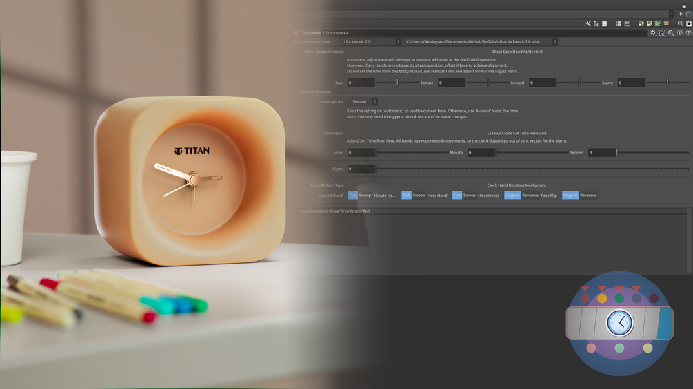 This HDA rigs any clock by adding the mechanism of an analogue clock making the hands move.